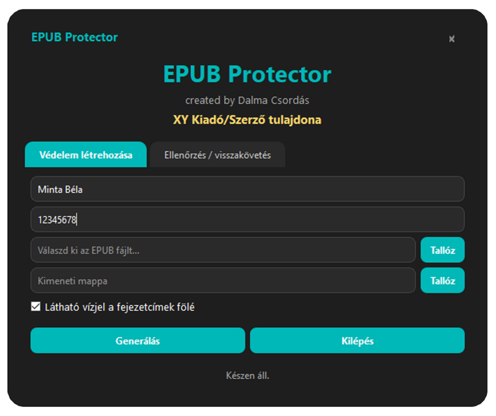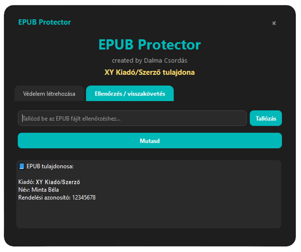 Az EPUB Protector egy professzionális e-book-védelmi szoftver, amely minden egyes digitális példányt egyedi, rejtett azonosítóval lát el. Minden fájl egyedi, minden olvasó azonosítható. Ha valaki illegálisan terjeszti az e-bookot, pillanatok alatt beazonosítható a forrás.